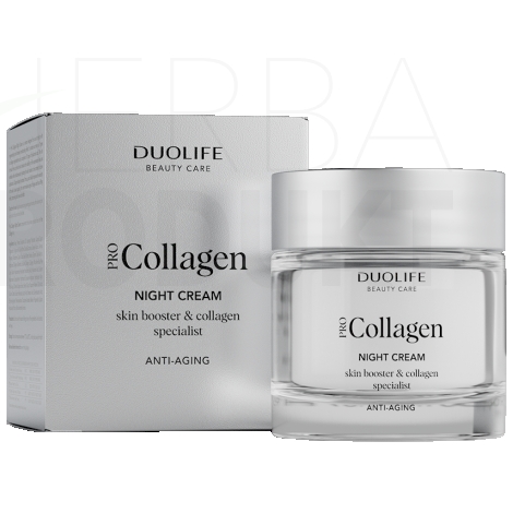 Pro Collagen Night Cream je nočný krém s regeneračným a intenzívne hydratačným účinkom. Obsahuje až 7 druhov kolagénových zložiek a komplex 5 druhov hyalurónových kyselín. Bohaté zloženie krému spevňuje a znižuje viditeľnosť jemných mimických liniek a vrások. Pokožku vyživuje aj vďaka obsahu aktívnych látok. Kolagén hĺbkovo hydratuje, spevňuje a viditeľne zlepšuje elasticitu pokožky. Pravidelné používanie krému má liftingový efekt, zlepšuje napätie, farbu a stav pokožky.