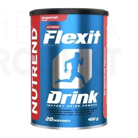 FLEXIT DRINK príchuť grep: hydrolyzát bravčovej želatíny, maltodextrín, glukonát vápenatý, glukonát horečnatý, L – Prolín, glukosamín sulfát draselná soľ (pôvod kôrovce), regulátor kyslosti kyselina citrónová, MSM (methylsulfonylmethan), chondroitín sulfát, aróma, vitamín C (kyselina L - askorbová), regulátor kyslosti kyselina jablčná, protihrudkujúce látky fosforečnan vápenatý a oxid kremičitý, sladidlá acesulfam K a sukralóza, kyselina hyalurónová (sodná soľ), aróma naringín, vitamín B6 (pyridoxín hydrochlorid), vitamín D3 (cholekalciferol). Výrobok obsahuje alergén kôrovca. Môže obsahovať stopy sóje a mliečne bielkoviny.