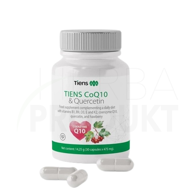 TIENS CoQ10 & Quercetin je potravinový doplnok, ktorý dopĺňa dennú stravu o vitamíny B1, B9, D3, E a K2, koenzým Q10, kvercetín a hloh.
